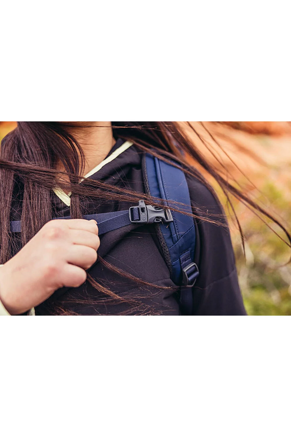 • Perforated, breathable shoulder harness with sternum strap featuring an integrated safety whistle